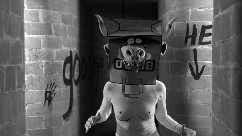 The final video in the trilogy, The Thong of Dionysus (2015), begins from the god of wine’s point of view. He surveys the wretched humans depicted on his vessels and comments on their fates, as the Greek gods were believed to be constantly judging mortals and shaping their futures. Here Dionysus is a stand-in for the artist, shaping stories and watching them unfold. He chastises Priapus for his egotistical ambition, his belief that he can control his own fate, and his plans to save the world. Dionysus advocates letting go of these illusions and enjoying life while one is living. Priapus wanders the labyrinth and finally finds the Minotaur’s dead body lying on the ground. He falls in love with her, not realizing that she has died of loneliness. He sees only that she is a hybrid creature like himself and so imagines a likeness of character and desires. Like Narcissus, he falls in love with his reflection and dies for it. Weak and malnourished from his time in the labyrinth, Priapus collapses next to the Minotaur, proving Dionysus’s point that as a mortal he will only die for all his efforts: “Spend all your time like a mime in a box, / acting smart in a carton, showing off in your coffin!”