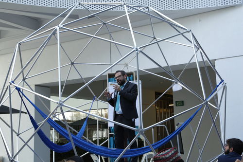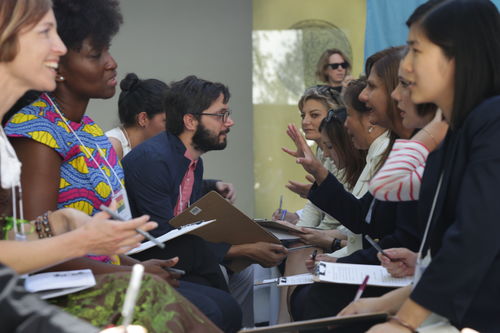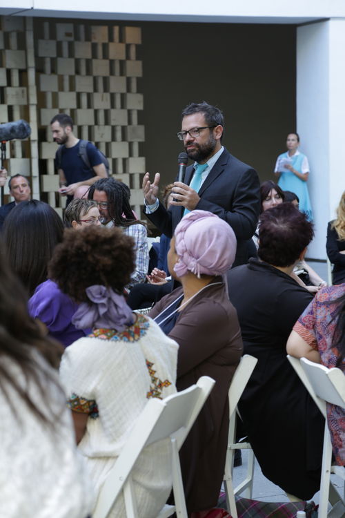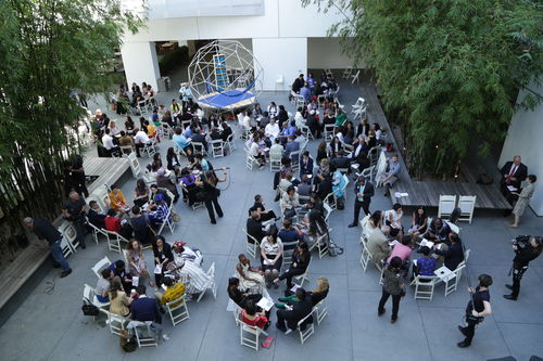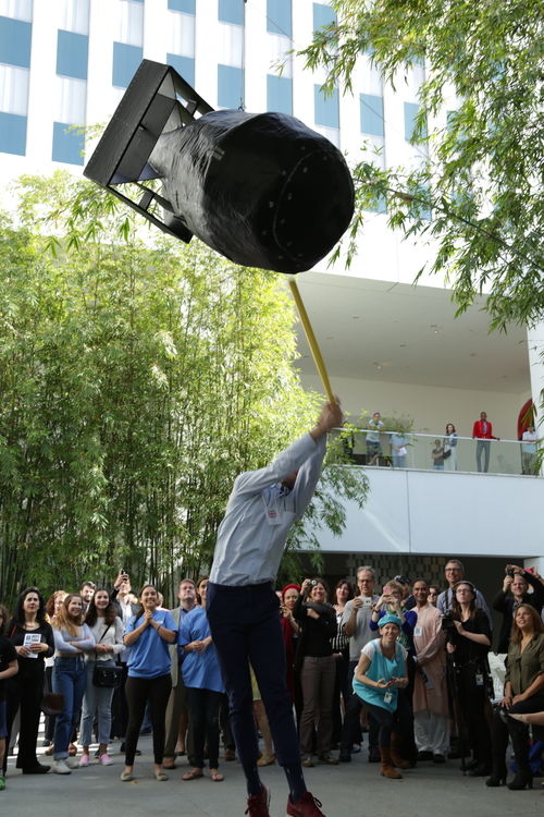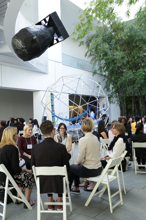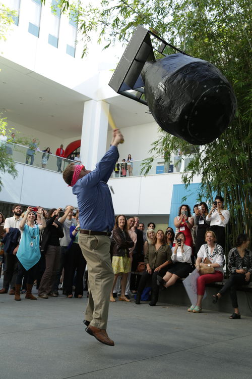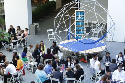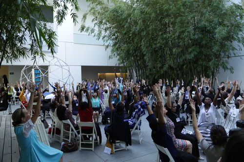 Participants engaged in activities in the Hammer’s courtyard that tested Reyes’s hypothesis that conflict-resolution techniques used in social psychology, theater, and art can help solve the world’s most challenging problems, from climate change, to fair wages for women, to food shortages. Over the course of two days, this group used theater games, group therapy, and techniques from social science to grapple with a set of urgent and sometimes unexpected proposals. Playfulness, humor, and experimentation are strategies that allow for creative solutions and imagining a better future.