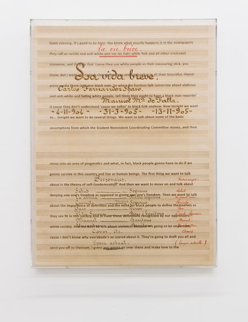In recent years Gaines has examined the relationship between music, politics, and speech. Librettos: Manuel de Falla / Stokely Carmichael is the first set of works in a new series in which he continues his exploration of systems, using musical composition and notation as an organizing structure. Whereas repetition and accumulation are critical to his earlier bodies of work, Librettos layers two distinct sources, allowing unexpected connections to emerge. Manuel de Falla / Stokely Carmichael brings together the score of a 1904 opera—La vida breve (Life is short) by the Spanish composer Manuel de Falla, which tells of a love affair doomed by social mores and class differences—and a 1967 speech delivered in Seattle by Stokely Carmichael, in which the civil rights activist and Black Panther Party member argued that African Americans should not serve in the Vietnam War.