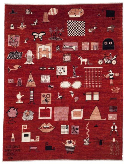 Each artist took a personal approach to her carpet. The knitter and photographer Lisa Anne Auerbach was already quite familiar with the techniques and challenges of translating a drawing into a woven image. Instead of using text, as she often does with her knitted works, she drew inspiration from traditional Greek and Roman mosaics illustrating gluttony with images of uneaten food and other detritus left on the floor following a grand banquet. Auerbach saw parallels between the crafts of mosaic and knitting, in particular a similar pixelation and distortion of the original image. Her design features crumpled plastic cups, cans, bottles, and rotten produce—the kind of trash she often finds outside her studio—with a border inspired by the ornamentation on the Fourth Street bridge in downtown L.A., near her Boyle Heights studio. Liz Craft had been thinking for years about putting together a retrospective of all her work but in miniature, and she had long been interested in Afghan war rugs, with their bright colors and crude line drawings. Like the war rugs that feature nontraditional motifs such as the World Trade Center towers, planes, missiles, bombs, and flags, Craft’s design features a drawn inventory of her sculptures (some of which were inspired by carpets) made since the late 1990s. She wanted her carpet to function as a marker of time with a narrative structure, similar to the diaristic quality often found in folk art.