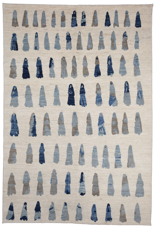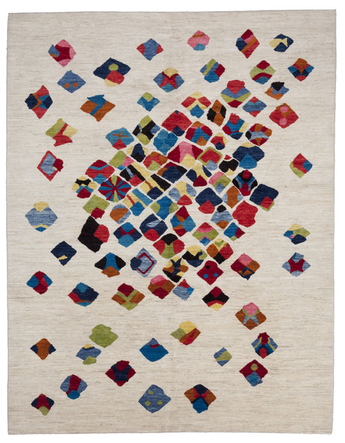 Carpets have been handwoven in Afghanistan for centuries and are the nation’s largest legal export. The craft is highly revered, and the traditional patterns and designs have remained mostly unchanged until recently, with growing exposure to modern and contemporary influences. In recent years carpet production has waned in Afghanistan, and most carpets woven there are washed, finished, and shipped from Pakistan. AfghanMade enlisted the renowned carpet expert Bulent Ozozan, who introduced many of the studios to industrial washers and taught them to cut and shave the carpets so that the quality met the standards demanded by high-end carpet producers around the world. Sanchez then invited a handful of respected carpet producers (including Farr) to make their carpets in Afghanistan. Farr proposed a collaboration with the Hammer Museum and worked with the museum to select the artists who would travel to Afghanistan and then create original designs to be made into carpets that would be handwoven there, exhibited at the Hammer, and sold, with the proceeds given back to support a charity for Afghan women. Many of the artists invited were eager for the opportunity not only to visit Afghanistan but also to collaborate with the women artisans who have developed the art of carpet making there.