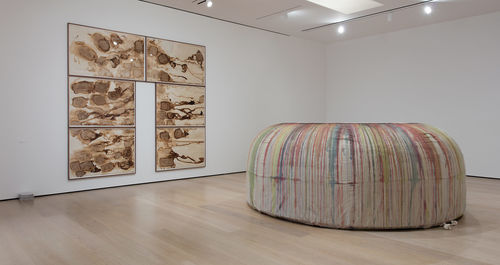 Filtration System for a process-based practice is a newly realized installation created for Made in L.A. 2018 that consists of a fiberglass sculpture covered in painted linen and a series of paintings. It is inspired by a concrete mound located in a man-made lake in Lincoln Park, in Los Angeles, which is an important source of inspiration for Argote, and informed the muted palette of pinks, yellows, blues, and earth tones in the paintings. The fiberglass sculpture assumed the function of a sort of makeshift workspace, “an island within her studio,” as she has put it, used to produce a series of circular paintings on muslin. These paintings have been tagged with numbers to indicate their place within the sequence, folded into wedge shapes, and stacked alongside the sculpture. The paintings and the large linen cover placed atop the sculpture evince Argote’s process, and the sculpture, too, bears evidence of its prior function as a workspace.