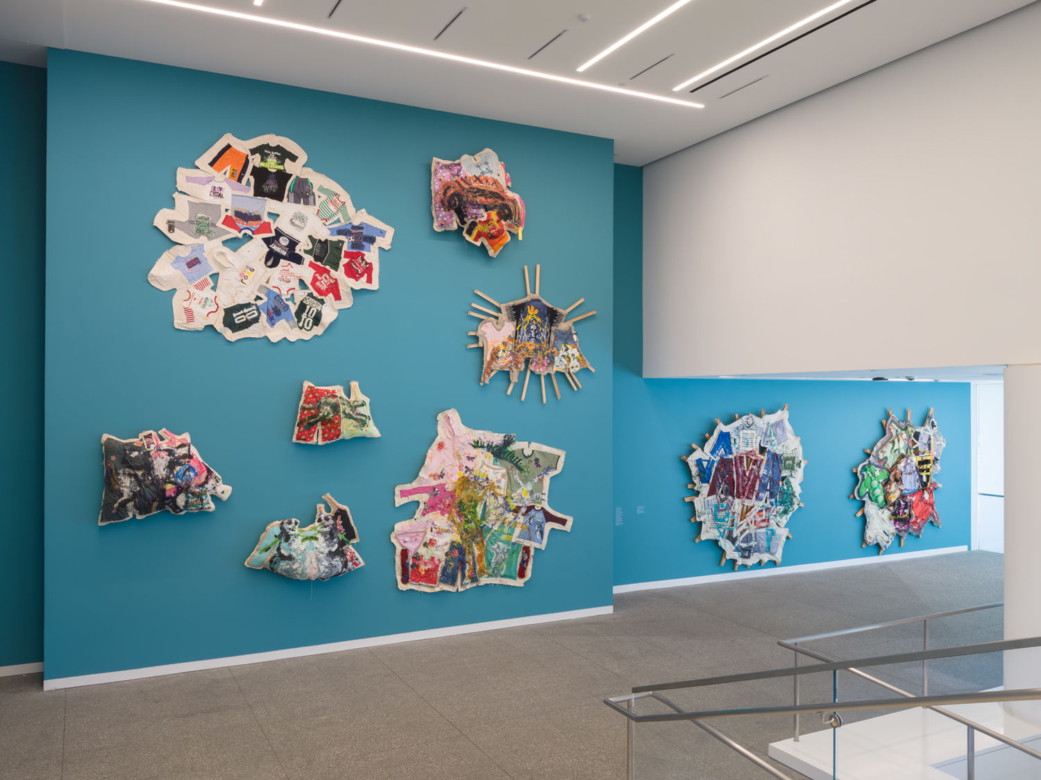 Mike Cloud is a Chicago-based artist who explores contemporary social and political issues through the visual language of abstraction. With an emphasis on painting, he makes mixed-media assemblages that are typically composed of stretcher bars configured into geometric shapes and universal forms with objects embedded in thick oil paint. For his Hammer Project, which will scale the facade of the lobby wall, Cloud will present three large, “loosely abstracted portraits,” including two forthcoming commissioned works, collaged from paper grocery bags, magazine advertisements, cash, and other printed materials. Alongside the portraits, Cloud will exhibit works from Painted Clothing (2007–8), a series of collages fashioned from children’s clothing, which comments on the relationship between consumer culture and childhood through visual signifiers such as dragons, fairies, and rainbows. Both series speak to the artist’s in-depth experimentation with printmaking, sculpture, and painting across his career. This Hammer Project marks the artist’s first solo museum presentation on the West Coast.