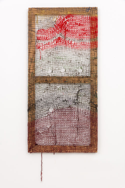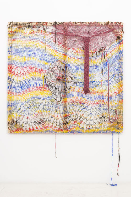 In Hansen’s “paintings”—hand-knitted constructions stretched on wooden frames—loops of yarn give form to a painterly abstraction or assert its uncertainty. Hansen picked up knitting almost a decade ago to preoccupy his restless mind and has been making paintings that way since 2010.Hansen is meticulously involved in every step of the process from start to finish. He dyes and spins different fiber blends—silk, alpaca, mohair, and wool, sometimes with holographic polymer threads added in—and then knits the strands on wooden needles. The slightly improvisatory appearance of his work is actually predetermined by a decision-making computer algorithm. His ongoing series of Quantum Paintings (2012– ), knit with yarns in finer gauges and stretched to their limits, are netlike fields that reveal the supports underneath.