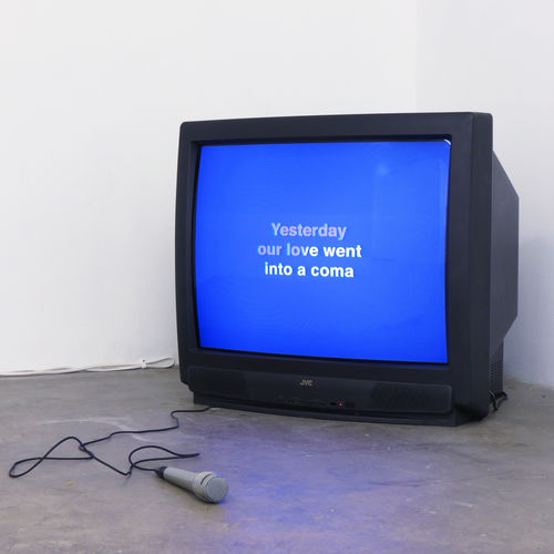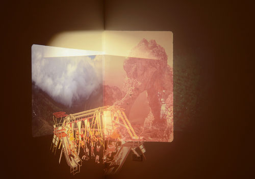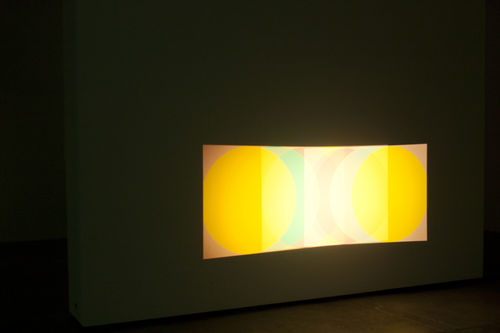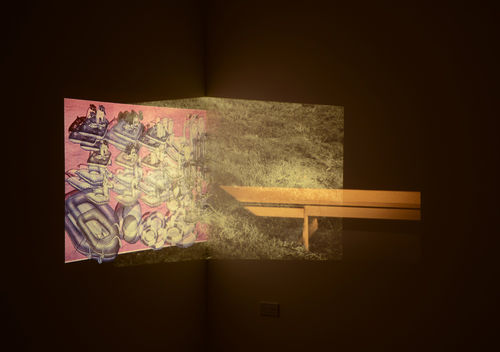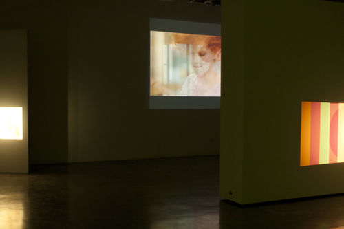 In The Forms of Love (2013), five slide projectors face the same corner of a room, their images overlapping. Each projector is set to a different speed and the carousels have no specific starting point, resulting in random combinations of images and signs at an uneven rhythm. As it comes full circle, The Forms of Love disrupts the audience’s expectations of a clear resolution or ending. Another disruption occurs in Lake Overturn (2013), featuring a three-channel projection in which a location scout drives through Southern California looking for a place to film a disaster movie. As she moves through Los Angeles, scenes from other films run through her mind, projected onto adjacent walls. The audience must continually turn their heads to take in—at the most—two projections in the same glance.