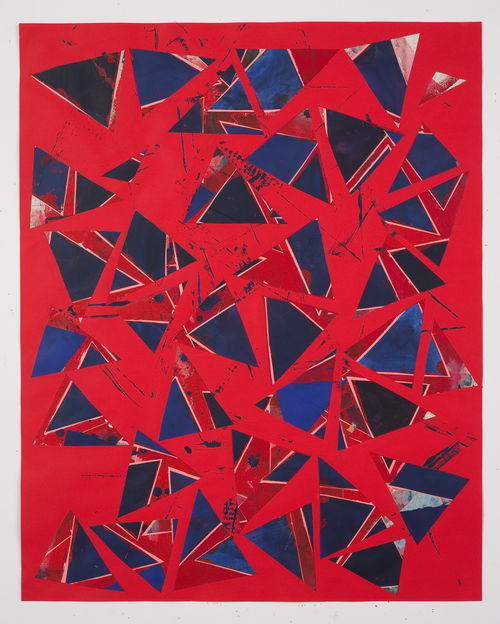 Dole-Recio sets rules related to how she makes her work, painting or making collages in tight, allover compositions based on a single motif—circles, stripes, triangles. She then further complicates the work by removing sections and replacing holes with cut shapes that don’t quite fit, frequently creating a picture plane that plays with the relationship between foreground and background.