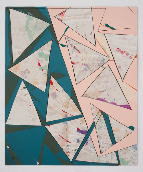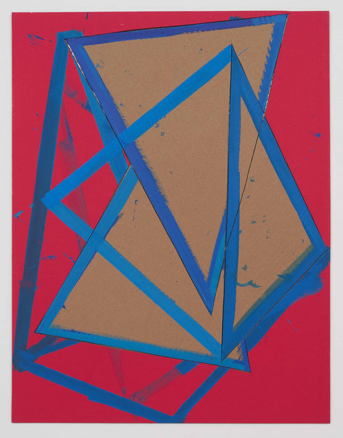 Lecia Dole-Recio’s works revel in an identity crisis. They are not quite paintings and not quite collages. They remain untitled, appended only by an indexical list in a clipped, short form of the materials and motifs that comprise them. These “painted constructions”—assembled from cut paper, cardboard, paint, and tape—boldly defy being classified.