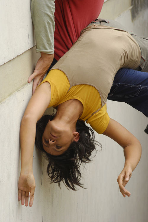 Dancers in a narrow passageway create an elegant, abstract, and lively piece of pure movement and form. David Fariás, Carla Schillagi and Maria Fernanda Vallejos.