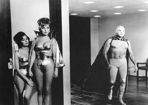 Extraterrestrials invade Earth seeking human specimens. Announcing themselves in apocalyptic television broadcasts, then tele-transporting themselves to private homes and public sporting events, the platinum-bewigged, mylar-clad, macho Martians, backed by scantly dressed female beauties as counterparts, kidnap select humans, obliterating others with vaporizing rays. But heroic masked wrestler “Santo” neutralizes the invaders with his incredible wrestling prowess, after respectfully consulting a famous scientist and the local priest—thus mediating between Mexico’s high-tech future and its traditional past to restore peace and order to the nation. ¡Bien hecho, luchador! (35mm, b/w, subtitles, 85 min.)