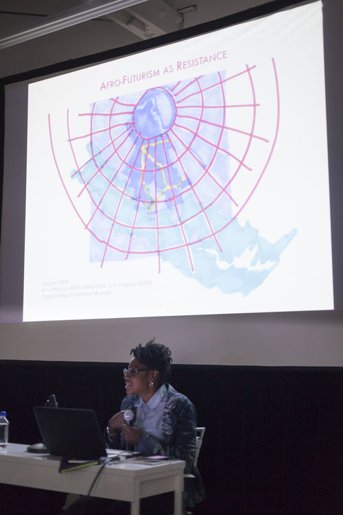 Cauleen Smith’s films, objects, and installations have been featured in group exhibitions at the Studio Museum of Harlem; Houston Contemporary Art Museum; the Blanton Museum of Art, Austin; San Diego Museum of Contemporary Art; Yerba Buena Center for Art; the New Museum, New York; D21, Leipzig; and Decad, Berlin. She has had solo shows at The Kitchen, New York; the Museum of Contemporary Art, Chicago; Threewalls, Chicago; and Women & Their Work, Austin, TX. Smith is the recipient of several grants and awards including the Rockefeller Media Arts Award, Creative Capital Film /Video, Chicago 3Arts Grant, and the Foundation for Contemporary Arts. Smith was born in Riverside, California and grew up in Sacramento. She earned a BA in Creative Arts from San Francisco State University and an MFA from the University of California, Los Angeles School of Theater Film and Television. She currently lives in Chicago while teaching at the Vermont College of Fine Art low-residency MFA program.