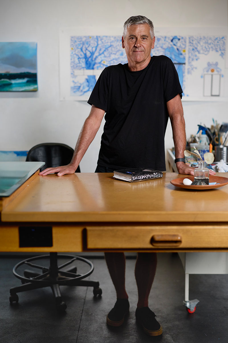 Sandow Birk (b. 1962, Detroit) develops expansive, multi-media art projects that deal with a wide variety of contemporary subjects, including inner-city violence, graffiti, social and political conflicts, surfing, and skateboarding. Birk grew up on the beaches of Orange County, CA, and his sister is a 25– year Veteran of the U.S. Coast Guard. Notable public art projects include a 400 square foot ceramic tile mural in collaboration with Elyse Pignolet for Hey Rookie Pool, San Pedro, CA (2017), and three large-scale, hand painted murals in collaboration with Elyse Pignolet for SF Jazz, San Francisco, CA (2013). Birk earned a Bachelor of Fine Arts from Otis Art Institute of Parsons School of Design (now Otis College of Art and Design) in 1988. His many awards include an NE A International Exchange Scholarship (1995) to study mural painting in Mexico City, a Guggenheim Fellowship (1996), a Fulbright Scholarship (1997), and a Gottlieb Foundation Individual Support Grant (2021). His work has been exhibited internationally and i s in the collections of the Los Angeles County Museum of Art (LACMA), Metropolitan Museum of Art, Harvard University Art Museum, Biblioteca Nazionale Centrale di Roma in Italy, and Kunstmuseum Reutlingen in Germany.